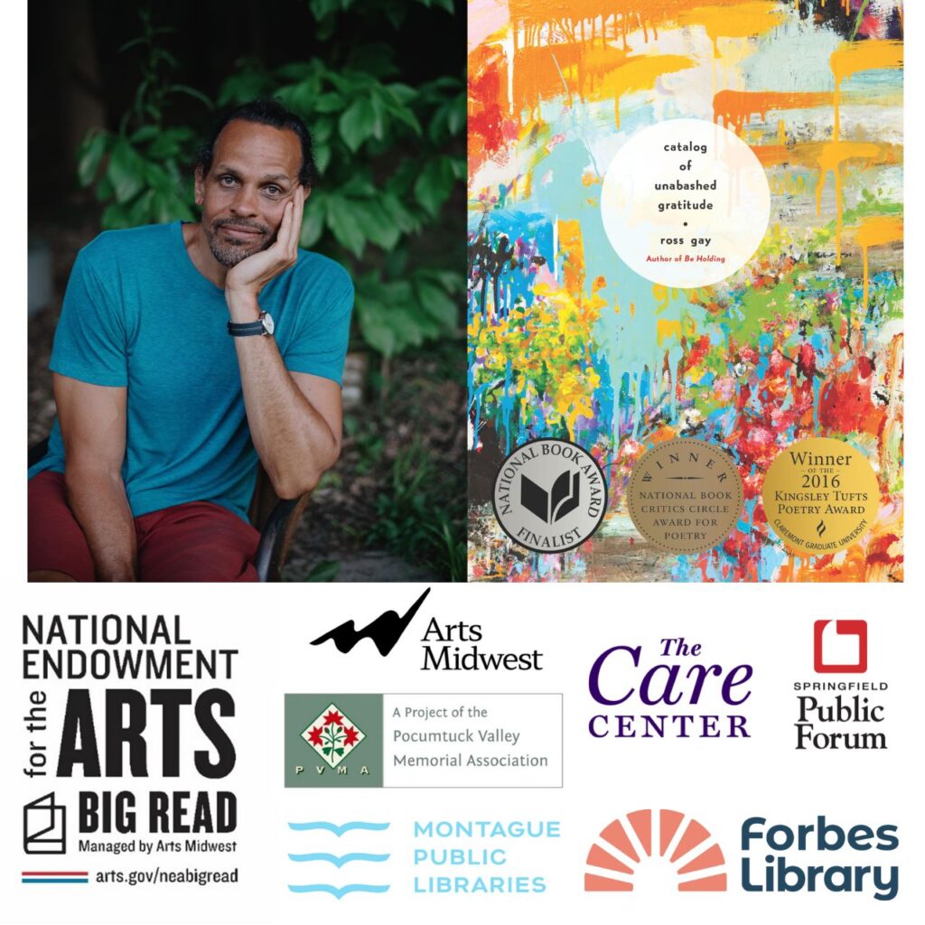 Join us as Ross Gay discusses his “Catalog of Unabashed Gratitude” a part of the NEA Big Read 2025. This is the keynote event for the Pocumtuck Valley Memorial Association and Montague Public Libraries NEA Big Read 2024/25, co-sponsored by the Springfield Public Forum, the All Hamptons Read, and The Care Center.